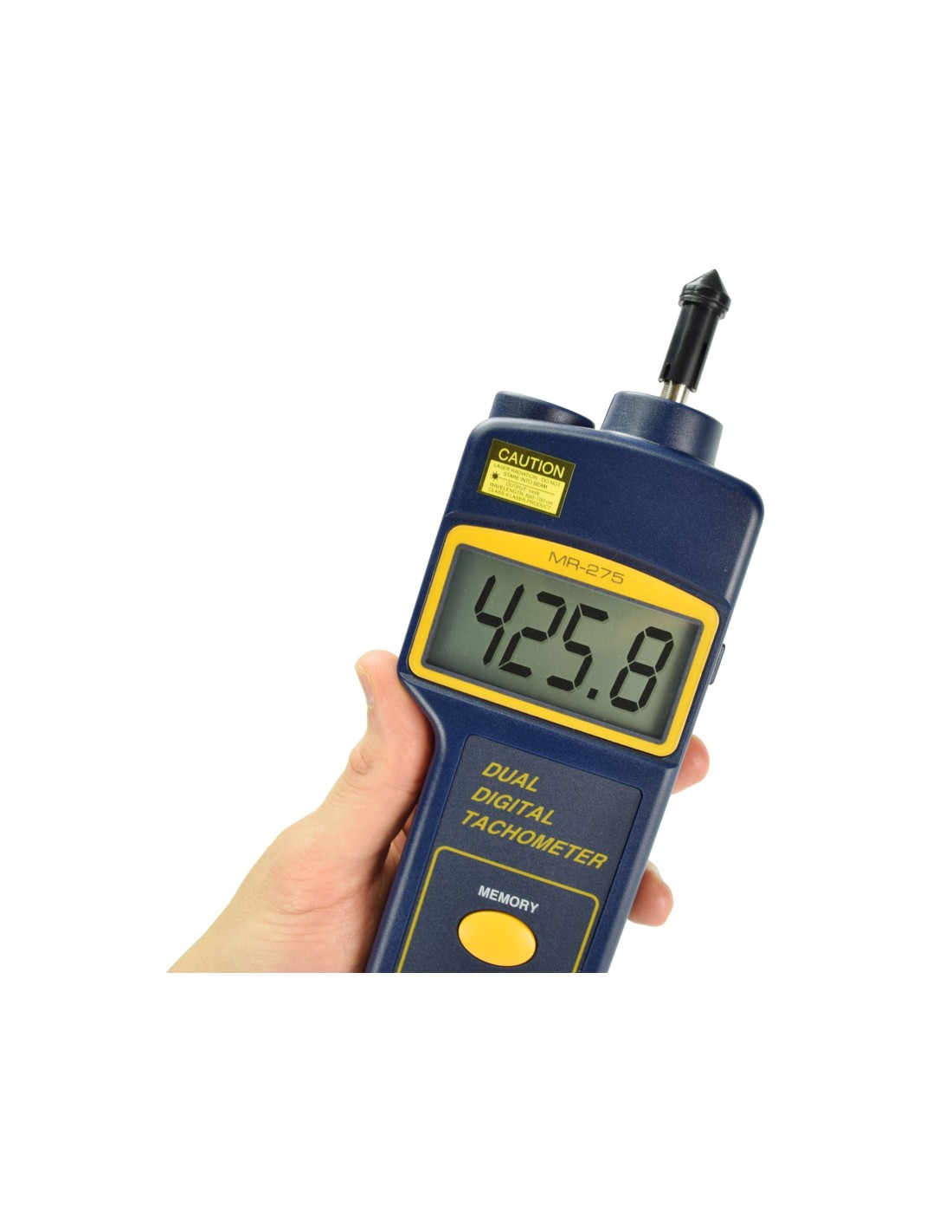 El MR-275 es un tacómetro dual mecánico-óptico que permitirá al usuario realizar medidas de revolución (RPM’s) y velocidad (m/min.). Sobre cualquier motor o aparato con una gran precisión (0,05%) y hasta una distancia de 1 m (sin contacto).