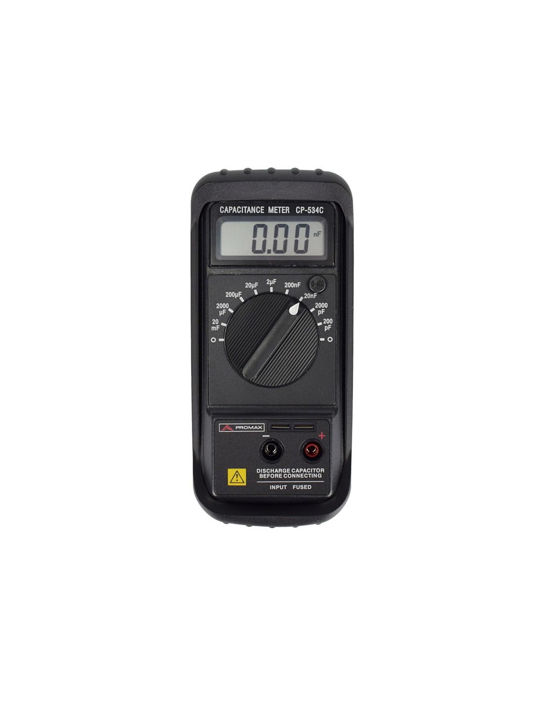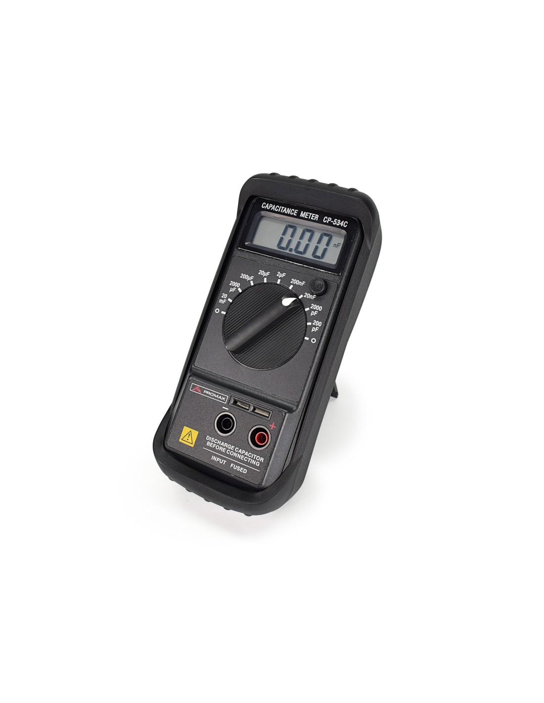 El capacímetro digital CP-534C mide con precisión capacidades de hasta 20.000 micro faradios. Para la medida de valores bajos posee un ajuste externo que permite compensar la capacidad residual entre los cables de prueba. Dispone de una autonomía de unas 200 horas.