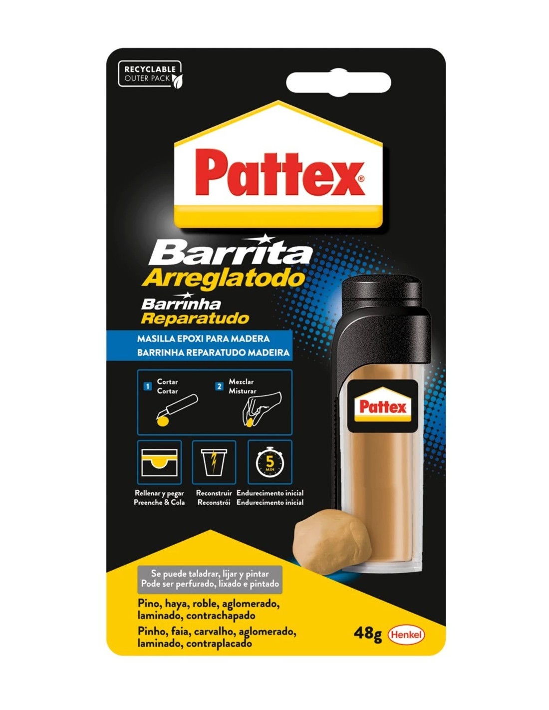 Pattex Barrita Arreglatodo Madera es una masilla bicomponente adecuada para aplicarla en pino, haya, roble, nogal, caoba, aglomerado, chapa y tablero DM, y también para pegar madera con otros materiales.