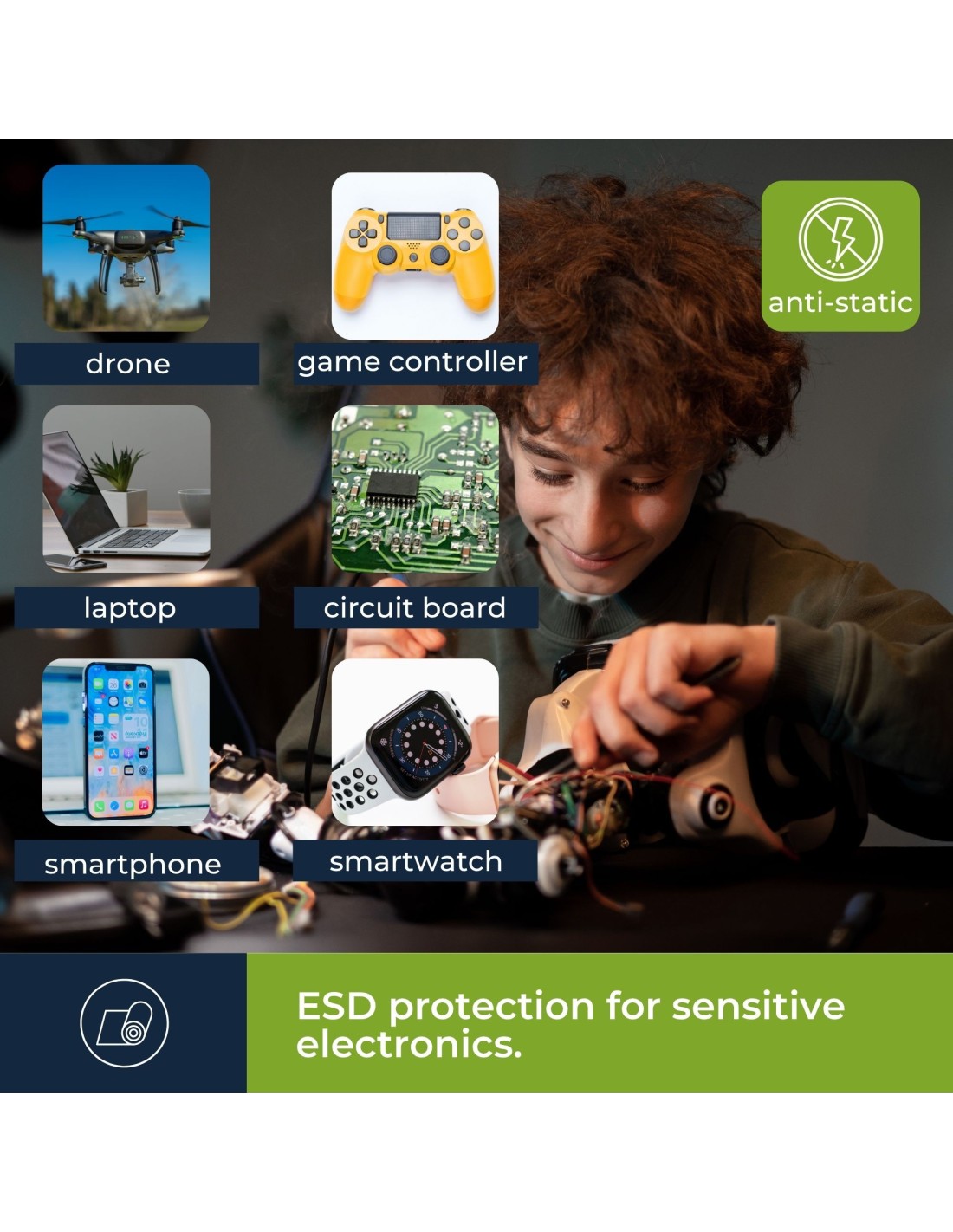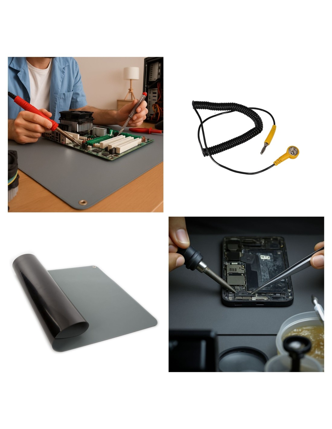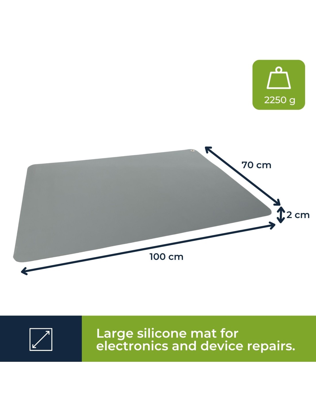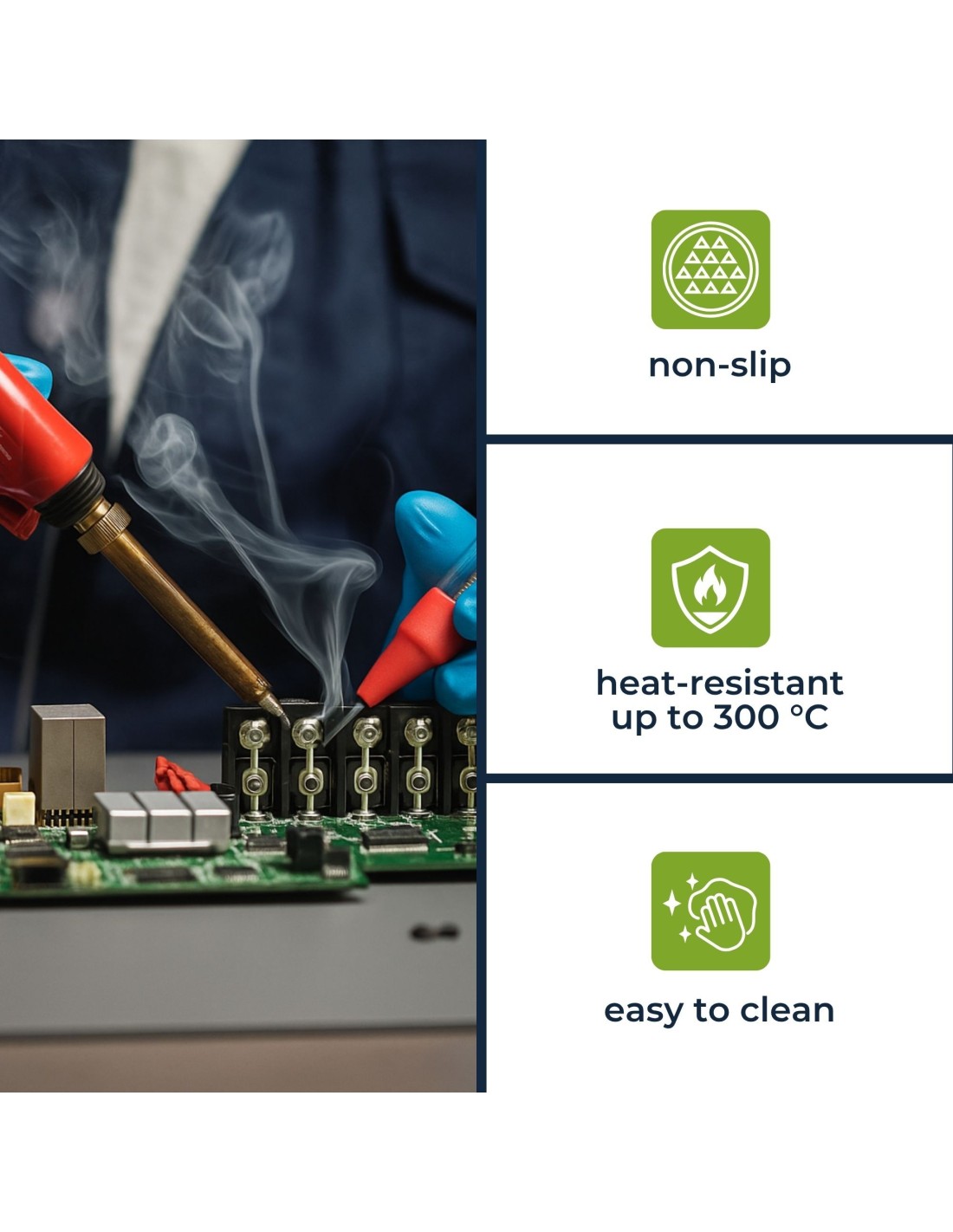 Al soldar, un entorno de trabajo limpio y seguro es más importante de lo que se cree. Velleman ofrece una amplia gama de alfombrillas de soldadura prácticas y de alta calidad para aficionados y profesionales. Esta alfombrilla ofrece un entorno de trabajo limpio y seguro contra descargas electrostáticas (ESD). Está hecha de silicona flexible e incluye un cable de tierra ESD. Con una resistencia térmica de hasta 300 °C, superficie antideslizante y unas dimensiones de 1000 x 700 mm, esta alfombrilla es ideal para todos sus trabajos de soldadura.