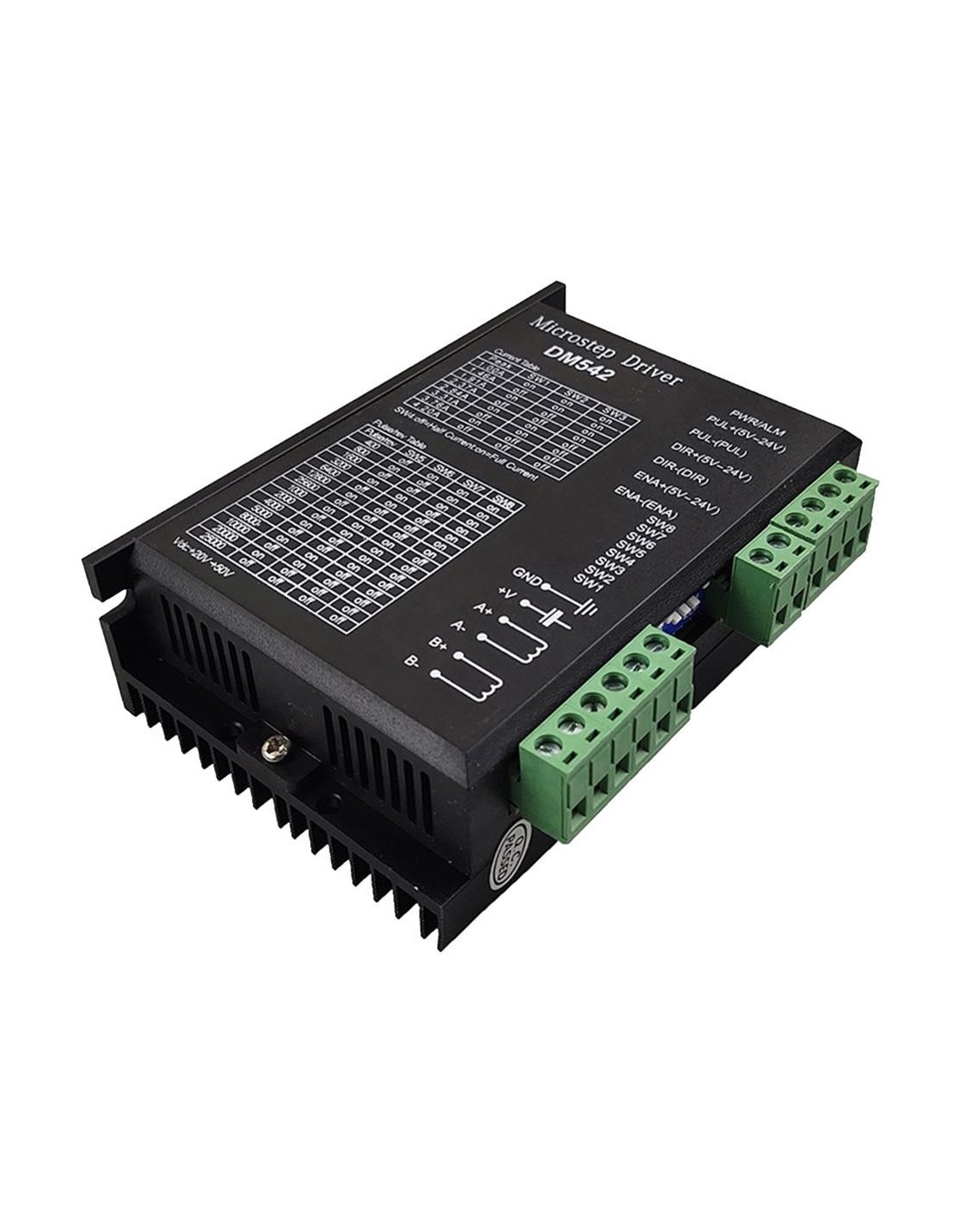 El DM542 es un tipo de motor paso a paso híbrido bifásico, cuyo voltaje de conducción es de 24VDC a 50VDC. Está diseñado para ser usado con motores paso a paso híbridos de 2 fases de todo tipo con un diámetro exterior de 42mm a 86mm y una corriente de fase inferior a 4.0A. Este circuito que adopta es similar al circuito de servo control que permite que el motor funcione suavemente casi sin ruido y vibración. El par de retención cuando el conductor del DM542 corre a alta velocidad, es también significativamente más alto que el otro conductor de dos fases, lo que es más, la precisión de posicionamiento es también más alta. Es ampliamente utilizado en dispositivos de control numérico de mediano y gran tamaño como máquina de curvado, máquina CNC, máquina de bordado por computadora, máquinas de embalaje y así sucesivamente. Características 1. Control de corriente media, accionamiento de corriente de salida sinusoidal de 2 fases 2. Tensión de alimentación de 18VDC a 50VDC 3. Señal optoaislada I/O 4. Protección contra sobretensión, baja tensión, sobrecorriente y cortocircuito de fase 5. Subdivisión de 15 canales y reducción automática de la corriente de reposo 6. Ajuste de la corriente de fase de salida de 8 canales 7. Terminal de entrada de comandos fuera de línea 8. El par del motor está relacionado con la velocidad, pero no con el paso/la revolución 9. Alta velocidad de arranque 10. Alto par de retención a alta velocidad